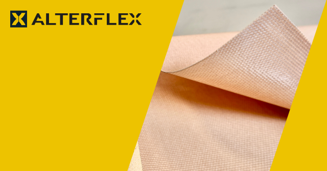 Tejido de fibra de aramida impregnado en PTFE, material técnico con altas prestaciones en cuanto a resistencia a la tensión y abrasión, resistencia térmica y barrera química. Recomendado para trabajos con mucha humedad y exigencias de resistencia a la tracción